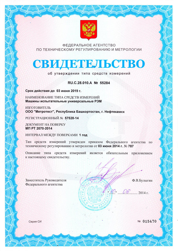 Машины разрывные РЭМ зарегистрированы в Государственном реестре средств измерений России № 57528-14, Республики Казахстан № KZ.02.03.06422-2015/57528-14 и Республики Беларусь № РБ 03 03 5681 15, имеют необходимые сертификаты и свидетельства, а также удостоены грамот и дипломов.
