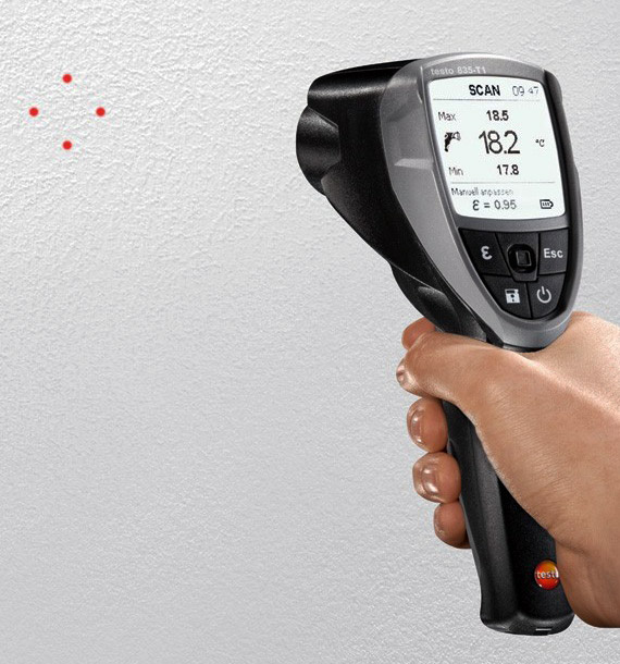 Testo 835-T1 - Ваш пропуск в мир интеллектуальных инфракрасных измерительных технологий. Удобный инфракрасный термометр предлагает максимальную надежность и высочайшую точность при измерении температуры миниатюрных объектов на значительном расстоянии, например, в процессе мониторинга температуры стен, поиска неисправностей в системах ОВК или контроле качества производимой промышленным методом продукции. Преимущества: - 4-х точечный лазерный целеуказатель отмечает область замера, что позволяет избежать ошибок;